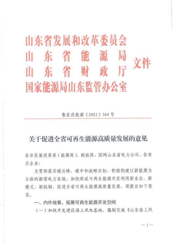 今日(7月16日)上午,山東省能源局發(fā)布了《關(guān)于促進(jìn)全省可再生能源高質(zhì)量發(fā)展的意見(jiàn)》,意見(jiàn)提到,為貫徹落實(shí)碳達(dá)峰、碳中和戰(zhàn)略目標(biāo),積極構(gòu)建以新能源為主體的新型電力系統(tǒng),加快形成可再生能源開(kāi)發(fā)利用新業(yè)態(tài)、新模式、新機(jī)制,促進(jìn)全省可再生能源高質(zhì)量發(fā)展,提出一系列意見(jiàn)。