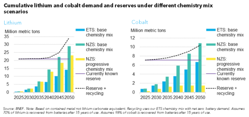 預(yù)計鋰、鈷、錳和鎳的供應(yīng)將足以滿足“經(jīng)濟轉(zhuǎn)型”情境分析下2030年之前的鋰離子電池需求。但在“凈零排放”情境分析下,鋰離子電池需求的快速增長將需要大量的原材料。電池回收是凈零方案的關(guān)鍵因素,否則2050年鋰的累計需求將超過目前已知的儲量。然而,隨著電池回收的普及,到本世紀中葉回收鋰的供應(yīng)量將超過當(dāng)年總需求量。