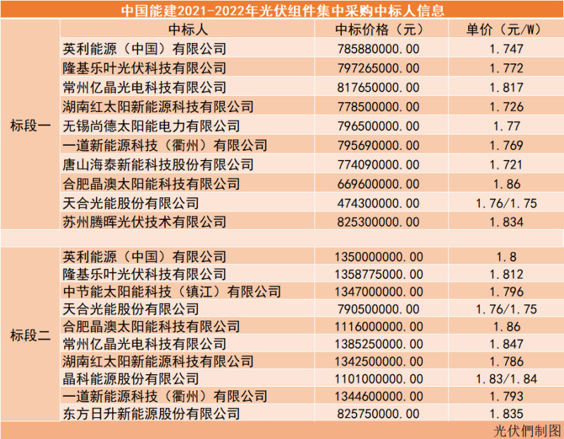此外,組件中標(biāo)公告顯示,標(biāo)段一和標(biāo)段二各有10名中標(biāo)人,需要說明的是,此次組件報價標(biāo)段一需要以TPT背板報價,標(biāo)段二報價包含鋁邊框。根據(jù)報價方式,本次招標(biāo)采用加權(quán)平均價的形式進(jìn)行投標(biāo),故開標(biāo)價格僅以加權(quán)平均價為準(zhǔn)。以下是組件具體中標(biāo)人信息以及單價。