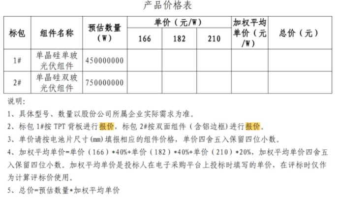 根據(jù)組件招標(biāo)文件,此次招標(biāo)劃分為兩個標(biāo)段:(001)單晶硅單玻光伏組件,450MW;(002)單晶硅雙玻光伏組件,750MW。此次招標(biāo)將確定中國能建2021-2022年光伏組件中標(biāo)供應(yīng)商,中標(biāo)人與股份公司簽訂框架協(xié)議,框架協(xié)議有效期一年。