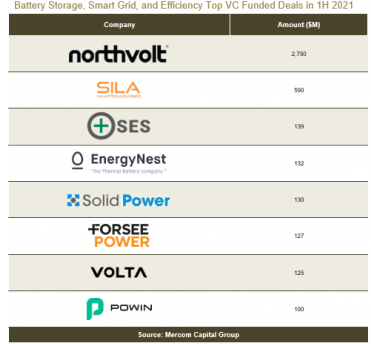 電池廠商和儲能廠商主導著企業(yè)融資的格局。下圖是2021年上半年的主要交易,包括電池儲能系統(tǒng)、智能電網(wǎng)和能源效率的廠商,但名列前茅的交易都是電池廠商和儲能廠商。