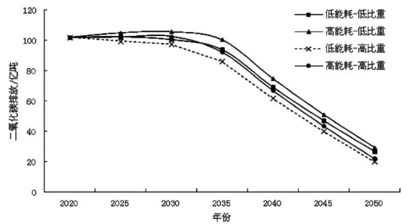 能源消費(fèi)總量和結(jié)構(gòu)的兩種情景設(shè)定結(jié)合,組成了四種未來能源轉(zhuǎn)型和碳減排情景:一是低能耗—低比重情景;二是高能耗—低比重情景;三是高能耗-高比重情景;四是低能耗—高比重情景。二氧化碳減排速度最快的是低能耗—高比重情景,其次是高能耗-高比重情景,再次是低能耗—低比重情景,最后是高能耗- 低比重情景。低能耗—高比重情景下,二氧化碳排放量有望在“十四五”期間達(dá)峰,其余三種情景下碳達(dá)峰將在“十五五”期間實(shí)現(xiàn)。如圖2所示,四種情景下能源轉(zhuǎn)型和碳減排都將在2035年之后顯著加速。2030年能源消費(fèi)二氧化碳排放量為97-105 億噸,到2035年下降至86-100億噸左右,到2050年降至20-29億噸,2050年可以實(shí)現(xiàn)能源消費(fèi)二氧化碳的深度減排,有望在2060年就實(shí)現(xiàn)近零碳排放能源體系。上述四種情景均能夠滿足2030年前碳達(dá)峰和2060年前碳中和的要求。