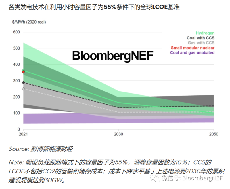 如今,太陽(yáng)能和風(fēng)能已經(jīng)成為電網(wǎng)脫碳的支柱。彭博新能源財(cái)經(jīng)的分析顯示,在電池的配合下,此類清潔能源發(fā)電容量有潛力幫助實(shí)現(xiàn)總發(fā)電量的70-80%脫碳。然而,對(duì)于有志于實(shí)現(xiàn)接近凈零排放的國(guó)家來說,這還不夠。因此,各類使用低碳技術(shù)的可調(diào)度電源開始登上舞臺(tái),以滿足清潔能源不足時(shí)的用電需求。本文從成本競(jìng)爭(zhēng)力的角度對(duì)該領(lǐng)域中的三位“種子選手”進(jìn)行了對(duì)比:氫能(hydrogen)、碳捕獲和封存(CCS)以及小型模塊化核反應(yīng)堆(SMR)技術(shù)。