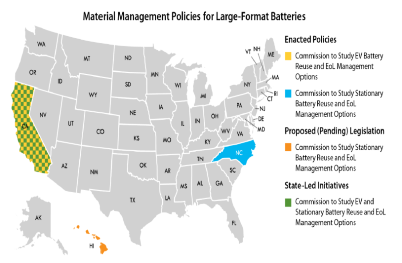 電池儲(chǔ)能行業(yè)利益相關(guān)者可能想考慮明確地解決在電池儲(chǔ)能系統(tǒng)和電動(dòng)汽車應(yīng)用中使用的大容量鋰離子電池的再利用、恢復(fù)和處理的狀態(tài)策略。截至2021年1月,沒有任何美國聯(lián)邦政策涉及大容量鋰離子電池的再利用或報(bào)廢管理選項(xiàng)。調(diào)查發(fā)現(xiàn),美國只有北卡羅來納州和加利福尼亞州的政策直接針對(duì)電池儲(chǔ)能系統(tǒng)和電動(dòng)汽車中使用鋰離子電池的再利用或報(bào)廢管理選項(xiàng)。不過,夏威夷州提出了一項(xiàng)法案,如果該法案頒布,將需要進(jìn)行全面研究,以確定處理和回收包括電池在內(nèi)的清潔能源材料的最佳實(shí)踐。加州還有一項(xiàng)由州領(lǐng)導(dǎo)的政策倡議,研究電池儲(chǔ)能系統(tǒng)和電動(dòng)汽車使用的鋰離子電池的再利用或報(bào)廢管理選項(xiàng)。圖2展示了美國解決電池儲(chǔ)能系統(tǒng)和電動(dòng)汽車中使用的大容量鋰離子電池的再利用、恢復(fù)和處置的政策。