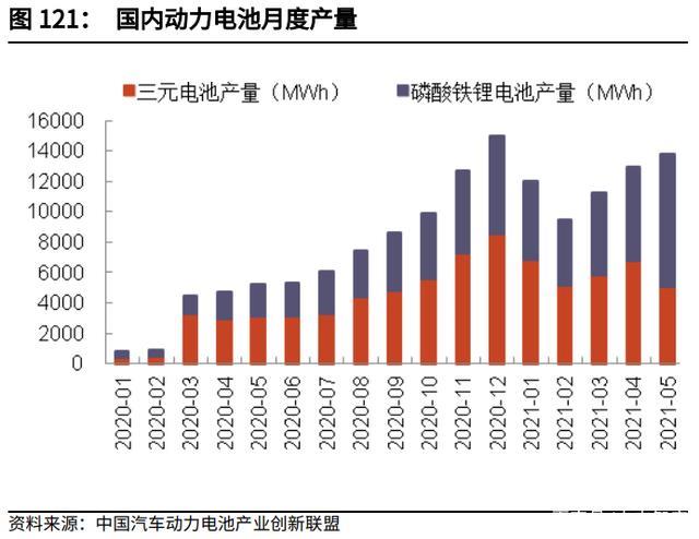 2020 年動力電池產(chǎn)量前低后高,2020 年二季度出現(xiàn)了減產(chǎn)的情況,之后逐月增 量,20Q4 高速增長,一直持續(xù)到 2021Q1。三元電池產(chǎn)量同比增長穩(wěn)健,主要 是磷酸鐵鋰電池產(chǎn)量快速增長,2020 年 12 月同比增速達(dá)到 452%。