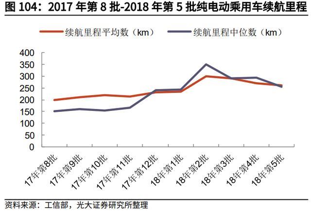 我們梳理了新能源汽車推薦目錄(2017 年第 8 批-2018 年第 5 批),新發(fā)布車 型和變更擴(kuò)展車型中,純電動乘用車?yán)m(xù)航里程的均值和中位數(shù)總體表現(xiàn)出提升趨 勢,2017 年第 8 批-2018 年第 5 批,均值由 199km 提升至 277km,中位數(shù)由 155km 提升至 270km;純電動乘用車電池系統(tǒng)能量密度也表現(xiàn)出增長趨勢,均 值由 123Wh/kg 提升至 133Wh/kg,中位數(shù)由 126Wh/kg 提升至 135Wh/kg。