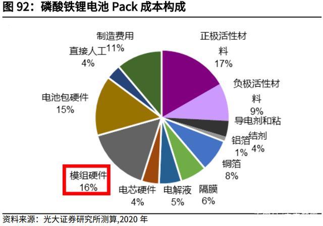 動力電池 Pack 主要由電芯、模組硬件、電池包硬件構(gòu)成。據(jù)我們的動力電池 Pack 成本構(gòu)成模型可見,電芯硬件在成本構(gòu)成中占比約不到 5%,模組硬件占 比約 13-16%,因此可以通過整合精裝電芯、模組硬件來達(dá)到降低成本的目的。