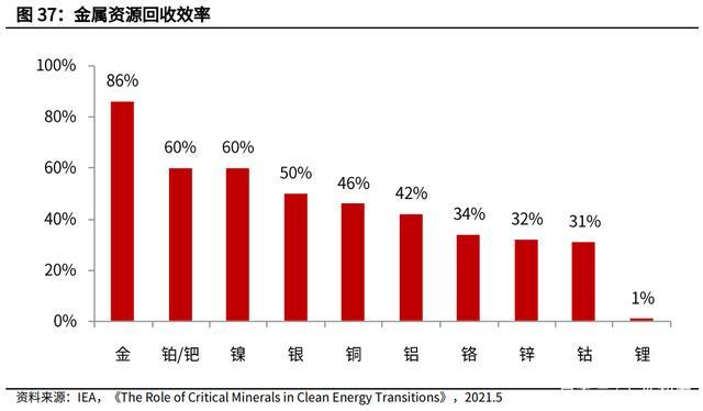 未來,廢舊動力鋰電池回收將會形成一個十分龐大的市場。目前全球?qū)τ阡嚭拖?土資源供給(電池和電機(jī)的核心礦物資源),還是圍繞一次資源提取供給為主。 根據(jù) IEA 的報告,當(dāng)下中鎳、鈷的回收率還可以,但鋰幾乎沒有回收能力(回收 率<1%)。我們可以預(yù)見進(jìn)入 TGWh 時代后,鋰電池大規(guī)模退役,上游礦物資 源缺口會引發(fā)龐大的回收浪潮。