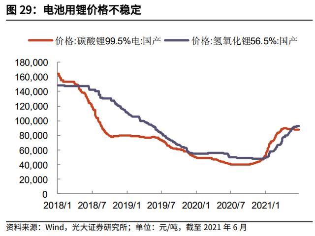 (1)根據(jù)鋰鹽的歷史價格,可以看出中國鋰鹽在 2015 年之前處于供需平衡狀 態(tài),碳酸鋰和氫氧化鋰的價格主要在 4 萬元/噸上下波動,整體變化不大。2015 年起,隨著中國新能源汽車的快速發(fā)展,國內(nèi)鋰鹽市場供小于求,鋰鹽價格大幅 快速上漲。2016 年電池級碳酸鋰的價格漲至近 18 萬元/噸。