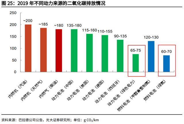 針對于不同車用動力源的全生命周期排碳水平,全球氫燃料電池龍頭巴拉德公司 也進(jìn)行了測算,其核心結(jié)論在于:能源供給側(cè)的清潔程度是決定因素,無論是鋰 電池汽車還是氫燃料電池車,如果電力或者氫氣來自于化石能源,那么其排碳水 平依然較高。所以若要能源需求側(cè)的汽車使用端減碳,還是需要推動能源供給側(cè) 使用清潔能源。如果能源供給側(cè)均使用清潔能源,那么鋰電池汽車和氫燃料電池 汽車全生命周期排碳水平分別為 65-75 g/km;60-70 g/km。