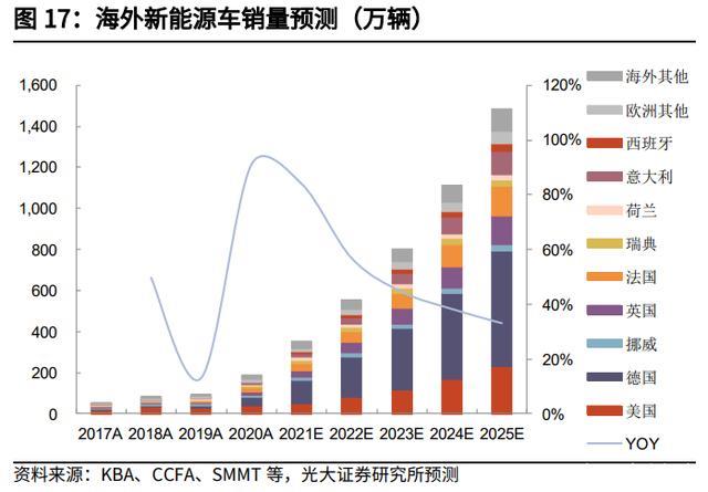 預(yù)計 2025 年海外新能源汽車銷量 1500 萬輛,動力電池裝機(jī)量 757GWh