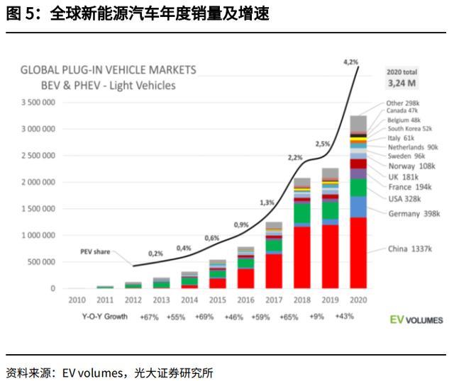 盡管 2020 年的新冠疫情導(dǎo)致全球汽車總銷量下滑了 14%,但全球電動汽車的銷 量卻在 2020 年逆勢大漲,達(dá)到 320 萬輛以上。根據(jù) EV volumes 數(shù)據(jù),2020 年全球新能源汽車的的銷量為 324 萬,而 2019 年同期為 226 萬,同比增長了 43.36%。