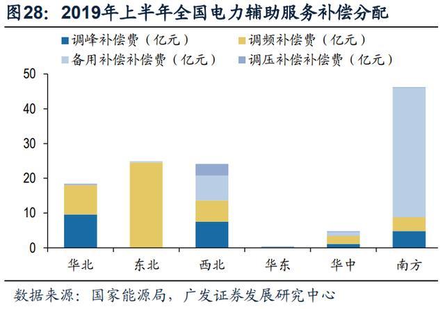 電力輔助服務主要包括調(diào)峰調(diào)頻、無功調(diào)節(jié)、電力系統(tǒng)備用和黑啟動,儲能參與調(diào)峰調(diào)頻商業(yè)模式清晰。調(diào)峰是指在用電高峰期為電網(wǎng)提供額外電量或響應新能 源消納降低輸出功率,而調(diào)頻則是對處于時刻波動的電壓和功率進行精準調(diào)節(jié),從 2019年上半年全國電力輔助服務補償分配情況來看,調(diào)峰調(diào)頻需求顯著。