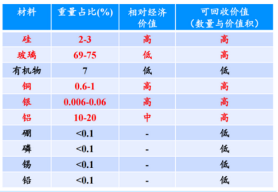 表1晶體硅光伏組件可回收材料價值分布