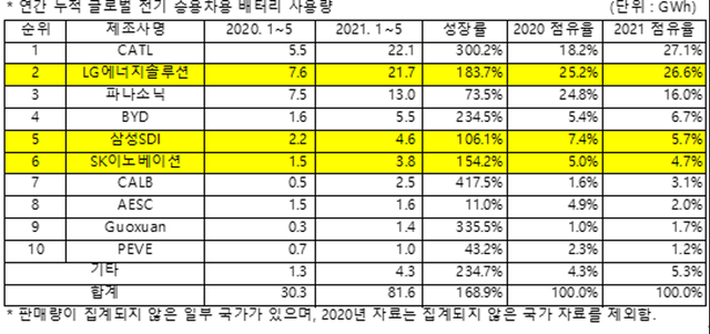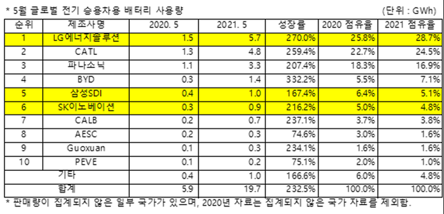 近日,韓國研究機(jī)構(gòu)SNE Research發(fā)布數(shù)據(jù)顯示,2021年5月,全球注冊(cè)電動(dòng)汽車的動(dòng)力電池裝機(jī)量為19.7GWh,同比增長232.5%。其中,LG新能源的動(dòng)力電池裝機(jī)量同比增長270%至5.7GWh,市占率升至28.7%,超越寧德時(shí)代位列第一。而寧德時(shí)代的電池裝機(jī)量為4.8GWh,同比增長近260%,市場(chǎng)份額為24.5%,排名降至第二。