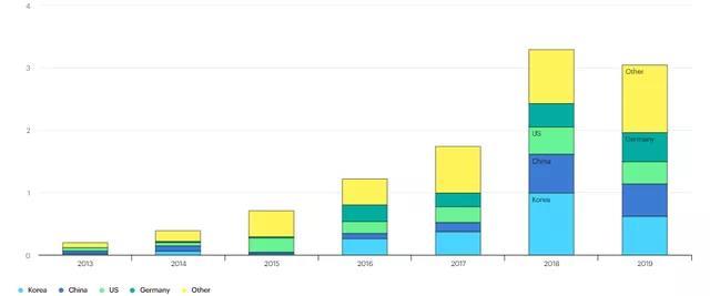 圖5 Annual energy storage deployment by country, 2013-2019