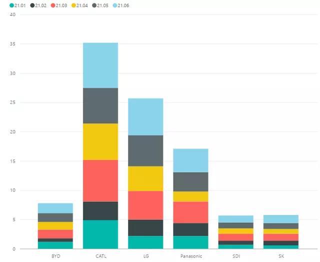 圖2 2021年上半年全球動(dòng)力電池的出貨量對(duì)比