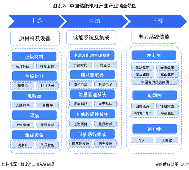儲能電池只要以鋰電池的形態(tài)存在,其上游原材料主要是鋰電池上游的參與者,其中,杉杉股份是上游原材料的重要參與者,其對正極材料、負(fù)極材料和電解液市場均有布局。儲能電池中游的儲能系統(tǒng)及集成主要參與者分為電池公司和軟件公司,前者主要生產(chǎn)鋰電池,如比亞迪、寧德時代,后者只要對儲能電池的軟件進(jìn)行研發(fā),如派能科技、陽光能源。儲能電池產(chǎn)業(yè)鏈下游電力系統(tǒng)儲能的發(fā)電側(cè)主要由五大發(fā)電集團(tuán)完成;在電網(wǎng)側(cè)主要企業(yè)有國網(wǎng)江蘇、許繼集團(tuán)、平高集團(tuán)等。