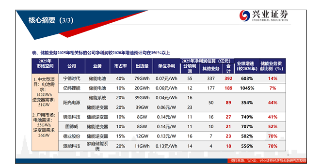 據(jù)興業(yè)證券預(yù)計,截至2021年底,化學儲能領(lǐng)域的電池PACK市場規(guī)模將達204億元,而到2030年,電池PACK的市場規(guī)模將超4000億元.而據(jù)興業(yè)證券測算,截至2025年寧德時代的儲能業(yè)務(wù)國內(nèi)市占率將達40%,并提供約55億元的利潤.按60倍市盈率的估值測算,屆時寧德時代的儲能業(yè)務(wù)將為其帶來超過3000億元的市值.