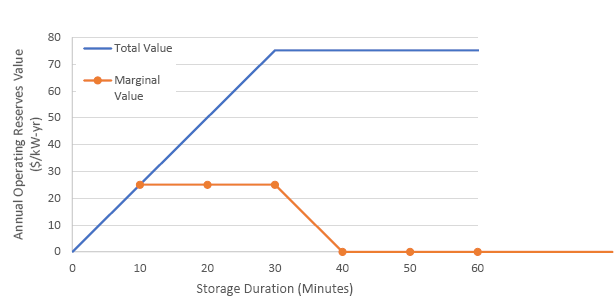 圖5(a)顯示了在亞利桑那州公共服務(wù)公司的電價6.26美元/ kW-月(75美元/ kW-年)情況下,提供運營備用服務(wù)和30分鐘持續(xù)放電時間要求的儲能系統(tǒng)價值的具體示例。一個持續(xù)放電時間為10分鐘的電池儲能系統(tǒng)的裝機容量需要減額到三分之一,以提供30分鐘的電力服務(wù),因此這個電池儲能系統(tǒng)每年將獲得大約25美元/千瓦(100%可用性)收入。這個曲線上的每個點顯示10分鐘儲能系統(tǒng)增量的值。其總值隨著儲能系統(tǒng)持續(xù)放電時間的增加而增加,直到持續(xù)放電時間達到30分鐘,此時為該服務(wù)添加額外持續(xù)放電時間的值為零。
