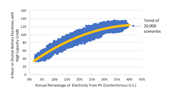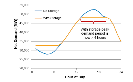 圖10在模擬場景中說明了這一概念,其中加利福尼亞州部署了充足的持續(xù)放電時間為4小時儲能系統(tǒng),以滿足每年約8%的峰值需求。在本例中,儲能系統(tǒng)將峰值需求期間擴展到約6小時,這意味著持續(xù)放電時間為4小時的儲能系統(tǒng)只能滿足三分之二的峰值期需求期間的容量。這種部署還將顯著降低儲能系統(tǒng)的能量時移價值。