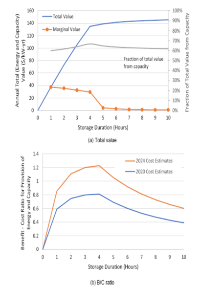 圖7和圖8中的價值組成部分的組合可用于估算總值,如圖9(a)所示。在這個例子中,大部分收入來自容量價值而不是能量時移,如圖中灰線所示,它代表來自容量總價值的一部分(假設需要4小時持續(xù)放電時間才能獲得90美元/kW-年的容量付款)。此外,一旦滿足持續(xù)放電時間的要求,能量時移的價值在超過4小時的增量非常小。這種組合推動儲能系統(tǒng)的經(jīng)濟性能作為持續(xù)時間的函數(shù),如圖9(b)所示,就其B/C比作為持續(xù)放電時間的函數(shù)而言,使用了圖3中所示的鋰離子電池儲能系統(tǒng)的成本曲線。