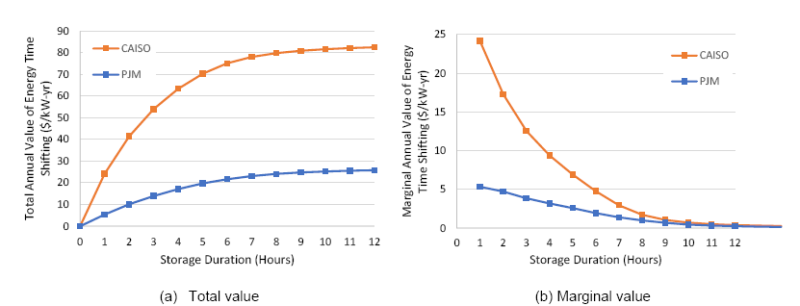 除了容量價值之外,圖8顯示了使用了在兩個區(qū)域批發(fā)市場部署的儲能系統(tǒng)能量時移的年度價值的2019年數(shù)據(jù)。雖然其價值由于所在位置和輸電限制等因素有著很大差異,但作為持續(xù)放電時間函數(shù)的價值的總體趨勢是相似的。該圖表明,儲能系統(tǒng)在第一小時的價值最高,因為在市場中套利最大。隨著價差的減小,這種增量值迅速下降,在超過大約10小時的容量之后接近零。