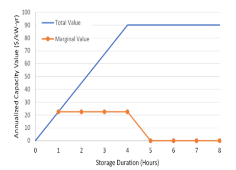 表3中的持續(xù)放電時間要求用于規(guī)劃目的以及容量市場。因此,持續(xù)放電時間4小時的電池儲能系統(tǒng)需要以與傳統(tǒng)天然氣發(fā)電設施相同的成本來提供容量服務。圖7顯示了儲能系統(tǒng)容量的總價值和邊際價值,假設需要4小時持續(xù)放電時間,容量付款為90美元/kW.年。