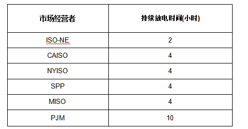 表3.美國各區(qū)域市場部署的儲能系統(tǒng)的持續(xù)放電時間要求