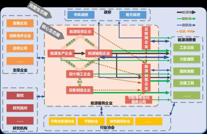 綜合能源服務的發(fā)展促使產業(yè)分工不斷細化,產業(yè)生態(tài)加速形成。綜合能源服務產業(yè)生態(tài)由能源消費者、能源服務企業(yè)、支撐企業(yè)、研究機構、行業(yè)協(xié)會、政府六部分共同構成,呈現(xiàn)出主體眾多、鏈條復雜的特點。