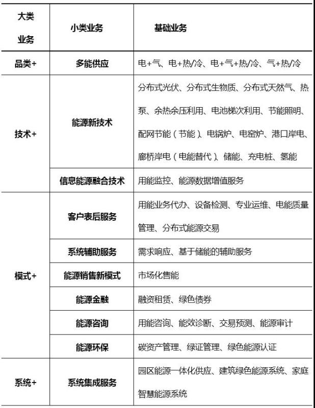 綜合能源服務業(yè)務類型十分豐富,從業(yè)務的“核心特征”來看,可分為“品類+、技術+、模式+、系統(tǒng)+”四大類,既有簡單組合式的“綜合”,又有融合創(chuàng)新式的“綜合”。梳理當前綜合能源服務商的典型業(yè)務,形成綜合能源服務全業(yè)務表(見表1)。
