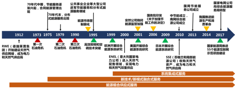 最早出現(xiàn)的綜合能源服務形式是能源品種組合。根據(jù)公開資料,電力和燃氣組合供應服務至少在1912年就已在德國出現(xiàn)。