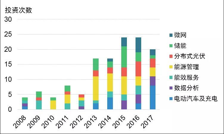 (3)通過風(fēng)險投資(VC)、私募股權(quán)投資(PE)進行前瞻性布局模式。2013年以來,綜合能源服務(wù)領(lǐng)域的風(fēng)險投資、私募股權(quán)投資顯著增多。其中對能源管理、儲能、電動汽車及充電投資次數(shù)最多,分別占25%、17%、16%(見圖3)。法國Engie集團是目前進行風(fēng)險投資最多的公司,廣泛投資電動汽車、儲能、數(shù)據(jù)分析等領(lǐng)域的優(yōu)質(zhì)初創(chuàng)企業(yè),使其能夠緊密追蹤技術(shù)發(fā)展并具有先發(fā)優(yōu)勢。
