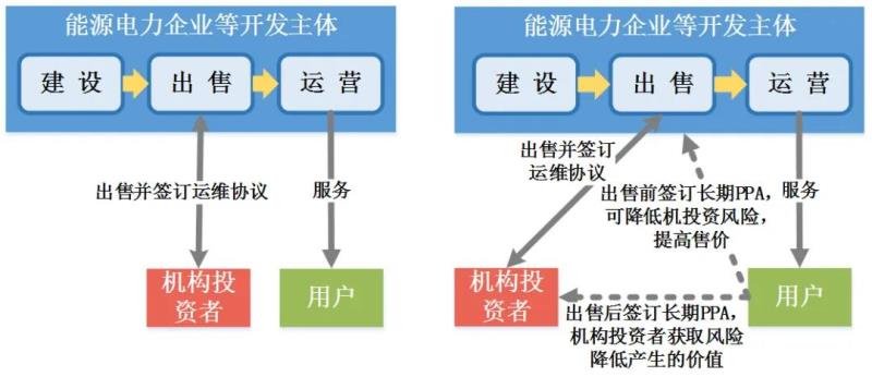 (1)重資產(chǎn)項目“建設(shè)-出售-運營”(BSO)模式。該模式指能源電力企業(yè)等開發(fā)主體完成項目建設(shè)后,將項目公司的全部或部分股權(quán)出售給機構(gòu)投資者,并與機構(gòu)投資者簽訂長期運維合同。在BSO模式基礎(chǔ)上,若資產(chǎn)所有者和用戶能夠簽訂長期電力購買協(xié)議(PPA),則能夠穩(wěn)定未來收入現(xiàn)金流,降低風(fēng)險,提升資產(chǎn)價值(見圖2)。該模式于2015年2月在歐洲被首次使用,意昂集團(E.ON)向意大利基礎(chǔ)設(shè)施投資基金(F2i SGR)出售價值1.14億美元的49MW光伏資產(chǎn)。截至2016年底,歐洲主要能源電力企業(yè)通過此模式獲利已超10億美元。隨著我國能源領(lǐng)域資產(chǎn)證券化水平提升,該模式有望迎來發(fā)展契機。