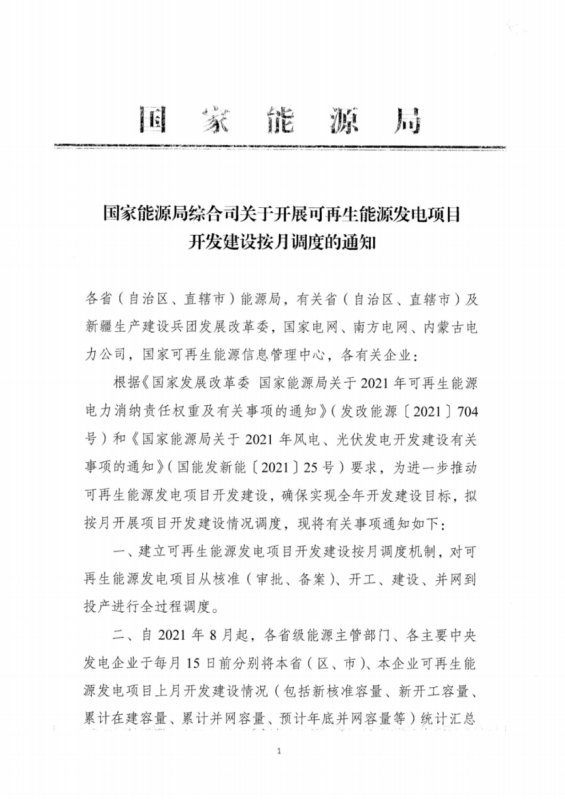 根據(jù)文件,自2021年8月起,各省級能源主管部門、各主要中央發(fā)電企業(yè)需每月15日前分別將本?。▍^(qū)、市)、本企業(yè)可再生能源發(fā)電項目上月開發(fā)建設情況(包括新核準容量、新開工容量、累計在建容量、累計并網容量、預計年底并網容量等)統(tǒng)計匯總后直報國家能源局新能源司。