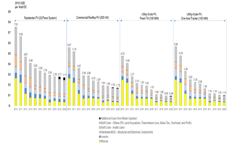 采用的基準(zhǔn)測(cè)試方法包括自下而上地計(jì)算安裝住宅、商業(yè)和公用事業(yè)規(guī)模太陽(yáng)能發(fā)電系統(tǒng)時(shí)產(chǎn)生的系統(tǒng)和項(xiàng)目所有必要的開(kāi)發(fā)成本,并對(duì)2019年第一季度和2020年第一季度的成本進(jìn)行了建模,其中并不包括任何先前的供應(yīng)協(xié)議或合同。