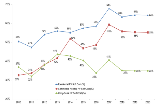 ·住宅太陽(yáng)能發(fā)電系統(tǒng)和商業(yè)太陽(yáng)能發(fā)電系統(tǒng)與公用事業(yè)太陽(yáng)能發(fā)電系統(tǒng)相比具有更大的軟成本百分比。