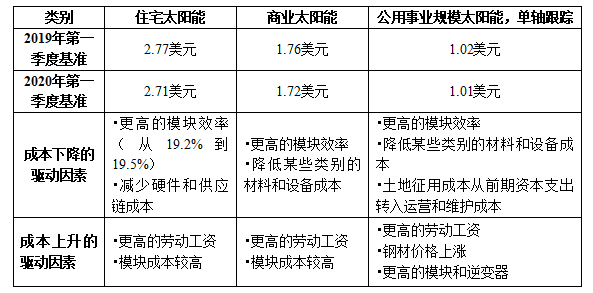?2019年第一季度和2020年第一季度基準(zhǔn)測(cè)試使用單晶硅太陽(yáng)能發(fā)電組件,而所有歷史基準(zhǔn)測(cè)試均使用多晶硅太陽(yáng)能發(fā)電組件。這種轉(zhuǎn)變反映了美國(guó)太陽(yáng)能市場(chǎng)發(fā)生的總體趨勢(shì)。