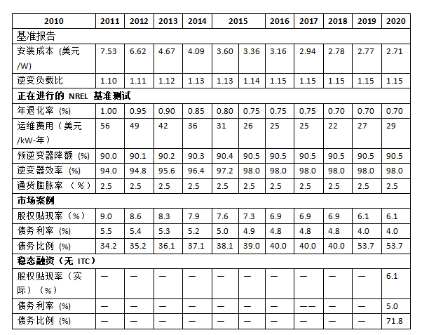 2010~2018年的所有數(shù)據(jù)均來自Fu、Feldman和Margolis(2018年)報告,并根據(jù)通貨膨脹進(jìn)行了調(diào)整。住宅太陽能發(fā)電系統(tǒng)即平準(zhǔn)化能源成本(LCOE)假設(shè):(1)系統(tǒng)壽命為30年;(2)聯(lián)邦稅率21%;(3)州稅率6%;(4)修正加速成本回收系統(tǒng)(MACRS)折舊計劃;(5)沒有聯(lián)邦或地方補(bǔ)貼;(6)運(yùn)營資金及償債準(zhǔn)備金占到運(yùn)營成本及償還債務(wù)的6個月(利率為1.75%);(7)三個月期建設(shè)貸款,利率為4%,手續(xù)費(fèi)為系統(tǒng)成本的1%;(8)發(fā)電模塊傾角為25度,方位角180度;(九)18年期限的債務(wù);(10)1億美元住宅項(xiàng)目池的TPO交易的110萬美元前期金融交易成本;(11)來自Feldman、Bolinger和Schwabe(2020年)的2019年和2020年財務(wù)假設(shè)。