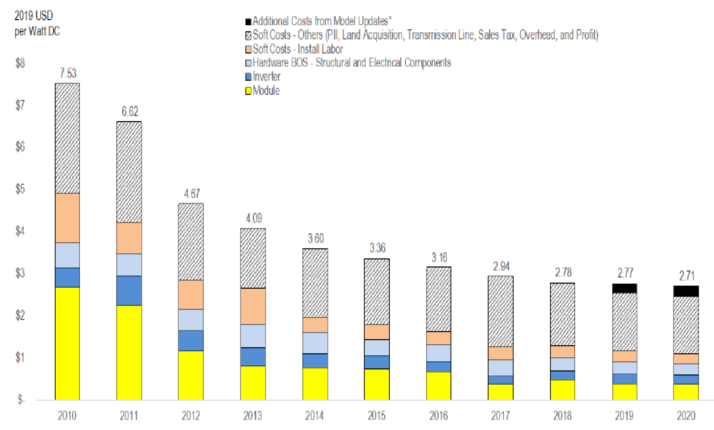 從2019年到2020年,住宅太陽能發(fā)電系統(tǒng)成本基準(zhǔn)下降了2%。
