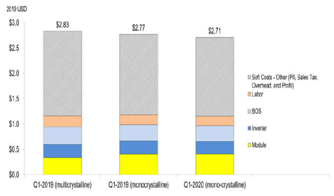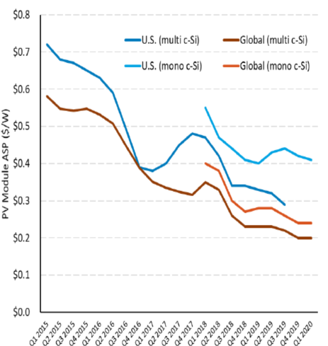 在過去幾年,美國市場對單晶硅太陽能發(fā)電組件的需求不斷增加,以至于到2020年對多晶硅太陽能發(fā)電組件的需求難以對2020年第一季度美國現(xiàn)貨定價進(jìn)行“一對一”比較;因此,在比較這兩種技術(shù)時,需要對2019年第一季度的成本進(jìn)行建模。而在2019年第一季度,其假設(shè)基于Wood Mackenzie和SEIA(2020)的Tier1單晶組件的出廠價格為0.4美元/W,而Tier1多晶組件的出廠價格為0.33美元/W。