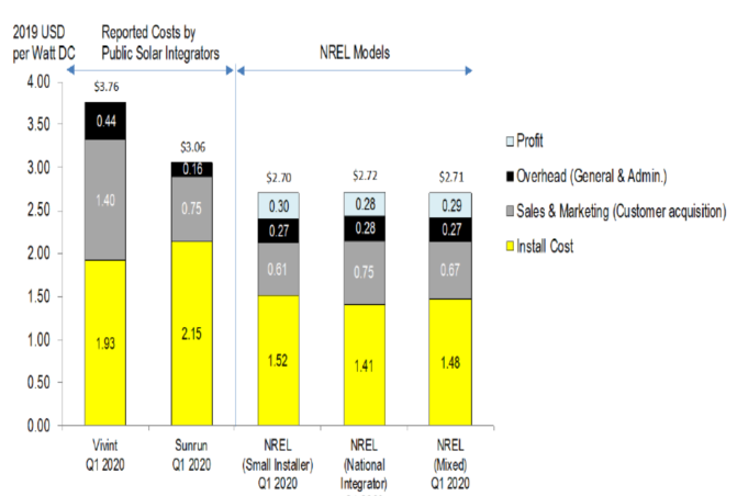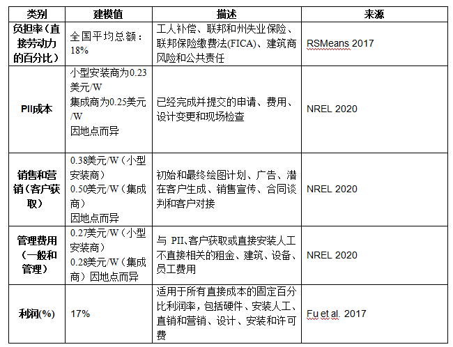 自下而上的建模方法產(chǎn)生的成本結(jié)構(gòu)不同于太陽能發(fā)電集成商在其公司文件中提到的成本結(jié)構(gòu)。由于集成商銷售和租賃太陽能發(fā)電系統(tǒng),他們采用與只是銷售商品的銷售商不同的報告成本方法。租賃太陽能發(fā)電系統(tǒng)的許多成本是在租賃期限內(nèi)產(chǎn)生的,而不是在銷售期間產(chǎn)生的,因此很難確定銷售的實(shí)際成本。盡管太陽能發(fā)電開發(fā)商Sunrun公司和Vivint Solar公司的文件按照季度來報告系統(tǒng)成本,但由于其公開文件缺乏透明度,因此很難確定這些成本的準(zhǔn)確性。安裝成本的部分差異可能會出現(xiàn)來自太陽能發(fā)電集成商在2020年第一季度安裝的系統(tǒng)中使用的先前合同。
