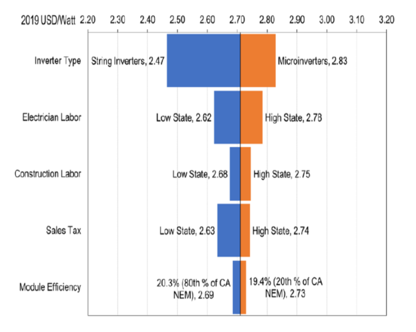 該圖顯示了混合部署情況下基準(zhǔn)的敏感性分析,成本類別因位置和硬件規(guī)格而異。逆變器類型對安裝太陽能發(fā)電系統(tǒng)成本的影響最大,使用組串式逆變器的成本為2.47美元/W,使用微型逆變器的成本為2.83美元/W。