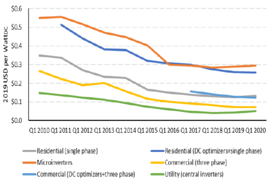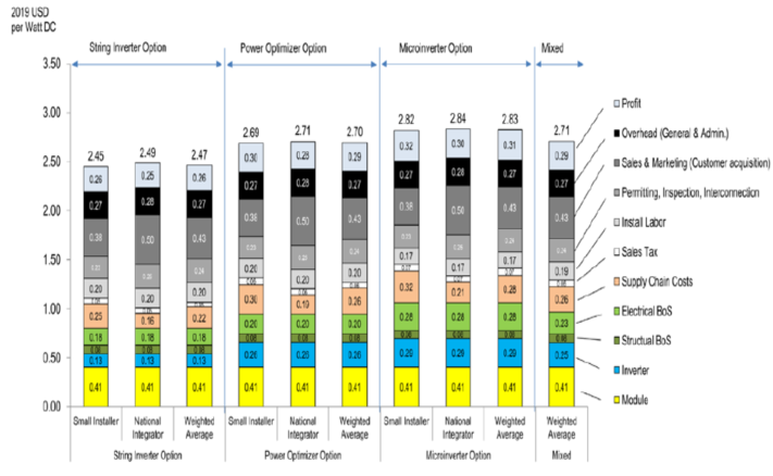 對于住宅太陽能系統(tǒng)成本計算,分別對組串級逆變器、功率優(yōu)化器和微型逆變器選項(xiàng)進(jìn)行建模,并在加權(quán)平均情況下在2020年第一季度模型中使用它們的市場份額(14.6%、49.8%和35.6%)。
