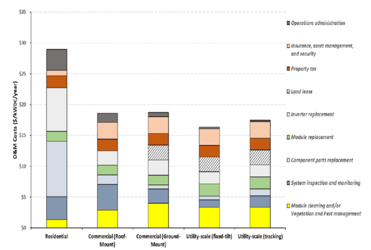 在2018年,美國能源部下屬的太陽能發(fā)電系統(tǒng)運(yùn)營和維護(hù)(O&M)工作組開發(fā)了一個模型用來計算與太陽能發(fā)電系統(tǒng)運(yùn)維相關(guān)的成本。成本模型中的133項(xiàng)措施分為9個運(yùn)維成本類別:逆變器更換、運(yùn)營管理、模塊更換、零部件更換、系統(tǒng)檢查和監(jiān)控、模塊清潔和/或植被和蟲害管理、土地租賃、財產(chǎn)稅、以及保險、資產(chǎn)管理和安全。目前的成本基準(zhǔn)是28.94美元/kW/年(住宅太陽能發(fā)電系統(tǒng))、18.55美元/kW/年(商業(yè)和住宅太陽能發(fā)電系統(tǒng))、18.71美元/kW/年(商業(yè)和地面安裝的太陽能發(fā)電系統(tǒng))、16.32美元/kW/年(公用事業(yè)規(guī)模太陽能系統(tǒng))和17.46美元/kW/年(公用事業(yè)規(guī)模太陽能系統(tǒng),單軸跟蹤器)