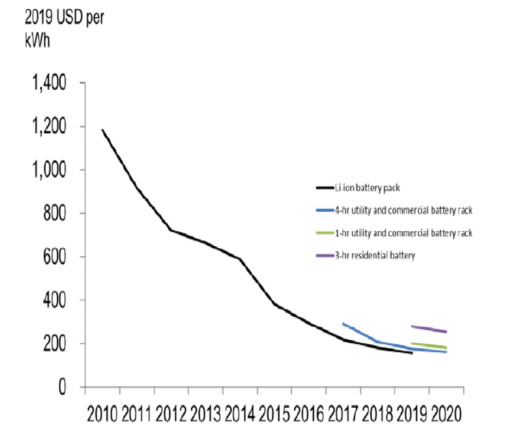 美國鋰離子電池現(xiàn)貨價格在2010年至2019年間大幅下跌(87%)。僅2018年至2019年,價格就下跌了13%。彭博新能源財經(jīng)公司(BNEF)的調(diào)查報告提到的鋰離子電池價格是指用于電動汽車和固定儲能系統(tǒng)的鋰離子電池的加權(quán)平均值。而在前幾年,由于缺乏不同持續(xù)放電時間的電池儲能系統(tǒng)的數(shù)據(jù)使用了加權(quán)平均值(即“鋰離子電池”價格)。在2020年第一季度基準(zhǔn)報告中,采用了彭博新能源財經(jīng)公司(BNEF)報告中的固定儲能系統(tǒng)的成本數(shù)據(jù),并按細(xì)分市場和持續(xù)放電時間進(jìn)行區(qū)分。盡管這一基準(zhǔn)報告中未提及,彭博新能源財經(jīng)公司(BNEF)的調(diào)查報告還提供了持續(xù)放電時間為30分鐘和2小時的商業(yè)和公用事業(yè)規(guī)模的儲能系統(tǒng)的電池成本數(shù)據(jù)。