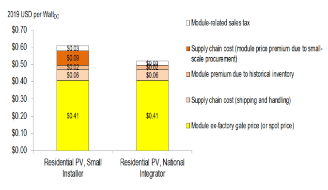 盡管商業(yè)和公用事業(yè)規(guī)模的太陽能發(fā)電系統(tǒng)開發(fā)商通常能夠以現(xiàn)貨價格或接近現(xiàn)貨價格采購太陽能發(fā)電組件,但住宅太陽能集成商和安裝商會產(chǎn)生額外的供應(yīng)鏈成本。當(dāng)以前采購的模塊安裝在現(xiàn)在的系統(tǒng)中時,其歷史庫存價格可能會導(dǎo)致住宅市場太陽能發(fā)電模塊價格的價格有所滯后(大約6個月)。