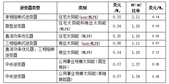 報告使用不同的DC-AC比率(上表)將美元/WAC價格從之前的逆變器價格數(shù)字轉(zhuǎn)換為美元/WDC。而在基準(zhǔn)測試中,使用美元/WDC計算所有成本,其中包括逆變器價格。該報告使用勞倫斯伯克利國家實(shí)驗(yàn)室的數(shù)據(jù)更新了逆變器DC-AC比率。