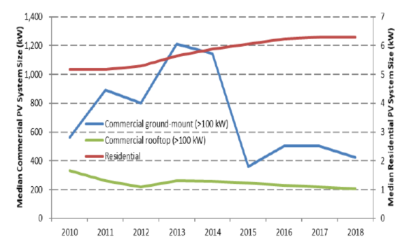 商業(yè)太陽能發(fā)電系統(tǒng)的規(guī)模變化更大,這可能反映了其用戶更加廣泛(例如寫字樓、商場和零售店)。該報告分別使用200kW和500kW作為商業(yè)住宅和地面安裝太陽能發(fā)電系統(tǒng)的基準(zhǔn)案例。