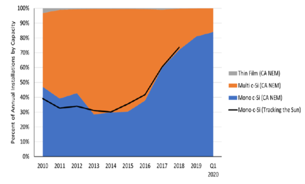 在2020年第一季度基準(zhǔn)報告中,使用單晶硅太陽能發(fā)電組件而不是之前的多晶硅太陽能發(fā)電組件對系統(tǒng)進(jìn)行建模,因?yàn)樽詮?016年以來美國市場轉(zhuǎn)向使用更多的單晶硅太陽能發(fā)電組件。